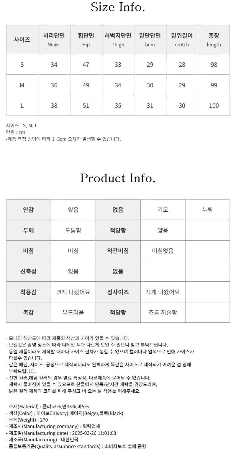 - 안감(없음),촉감(적당함),착용감(정사이즈),신축성(없음),두께감(적당함),비침(약간비침),사이즈(S(25~26),M(27~28),L(29~30))