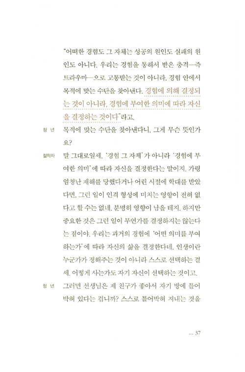 아들러 심리학을 공부한 ‘철학자’와 세상에 부정적이고 열등감 많은 ‘청년’이 다섯 번의 만남을 통해 ‘어떻게 행복한 인생을 살 것인가?’라는 우리 모두가 궁금해하는 질문에 답을 찾아가는 여정을 그렸다. 플라톤의 명저 『대화편』을 차용한 구성으로 마치 연극을 보는 듯한 느낌을 주어 쉽고 흥미진진하게 읽을 수 있으며, 생동감마저 느껴진다.