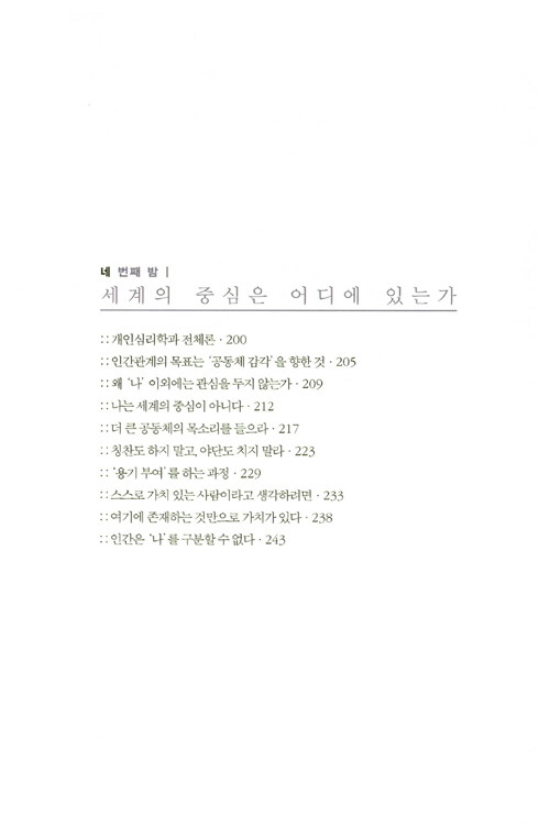 첫 번째 밤 ‘트라우마를 부정하라’, 두 번째 밤 ‘모든 고민은 인간관계에서 비롯된다’, 세 번째 밤 ‘타인의 과제를 버리라’, 네 번째 밤 ‘세계의 중심은 어디에 있는가’, 다섯 번째 밤 ‘지금, 여기를 진지하게 살아간다’의 순서로 진행되는 철학자와 청년의 대화는 점점 긴장을 불러일으키며 재미를 더한다. 특히 철학자의 주장에 이어지는 청년의 반박이 공감대를 한껏 불러일으킨다.