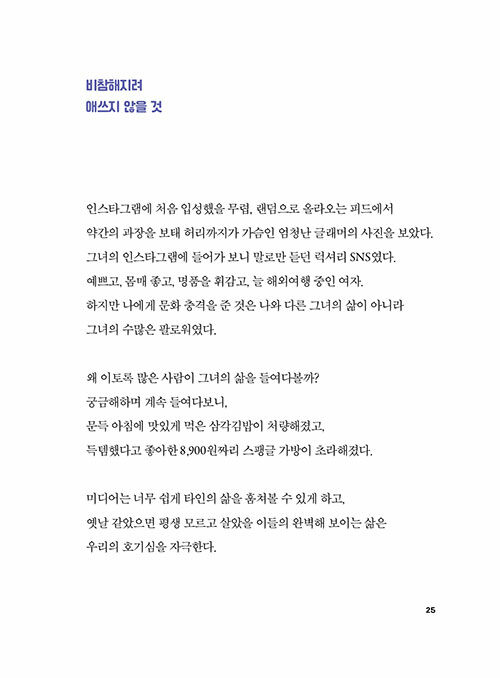작가는 이 책에서 있는 그대로의 자신을 긍정해야 하는 이유와 그렇게 살아갈 방법을 따뜻하면서도 정확한 언어로 표현한다. 그리고 모든 글의 끝엔 유쾌하고 다정한 그림이 더해져 자신이 말하고자 하는 메시지를 더욱 온전히 전달한다.