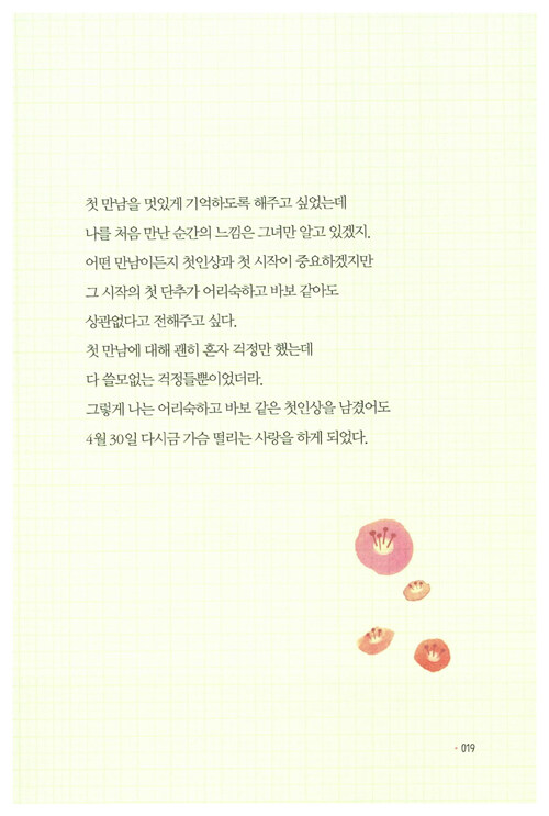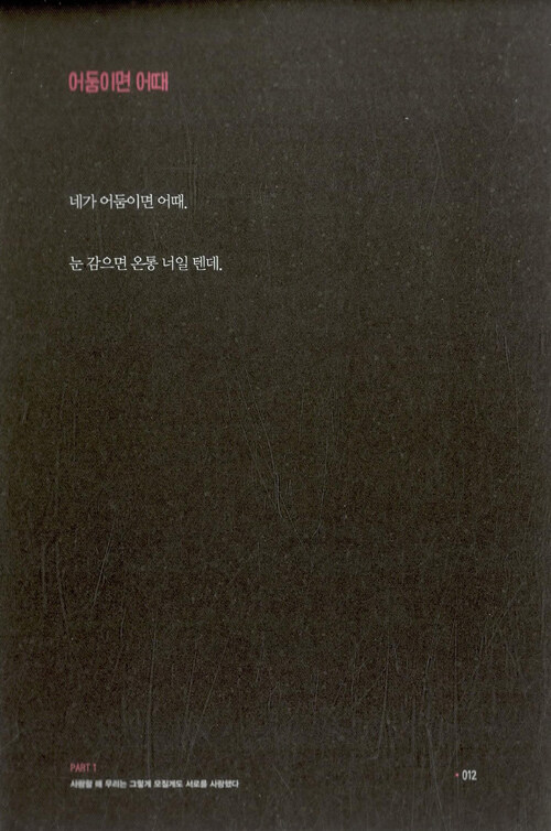 걱정하지 말고 설레어라•010 어둠이면 어때• 012 한달 - 사랑의 시작 • 014 꽉•017 4월 30일•018 연애•021 밤하늘• 024 내 하루는 온종일 너로 가득해•026 마음• 028 익숙함•029 솔직한 이야기•030 구속•032 첫사랑•034 첫눈•036 드라마• 038 사랑할 수 있을 때 후회 없이 사랑하라•043 이기적•044 장미•046 악몽과 깨달음• 047 미안해•048 자격•050 학창시절•052 메신저• 055 널 사랑하는 밤• 056 미련한 행동• 058 해서는 안 될 말•060 이유•062 소중한 사랑•064 다툼•065 표현•066 둘이서 하는 사랑•068 지금 우리는 권태기• 070 여행• 072 내 삶의 활력소•074 너와 내가 우리가 되어도•076